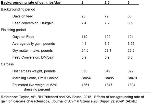 Calves with a lower backgrounding rate of gain were fed for more days to reach the common backfat thickness. Calves had increased ADG during the finishing period when the backgrounding ADG was lower. Hot carcass weights were also heavier when backgrounding ADG was lower. However, the researchers commented that marbling appears to be best when calves are not grown to slow or too fast and this data set identified 2.5 pounds ADG had better marbling scores.