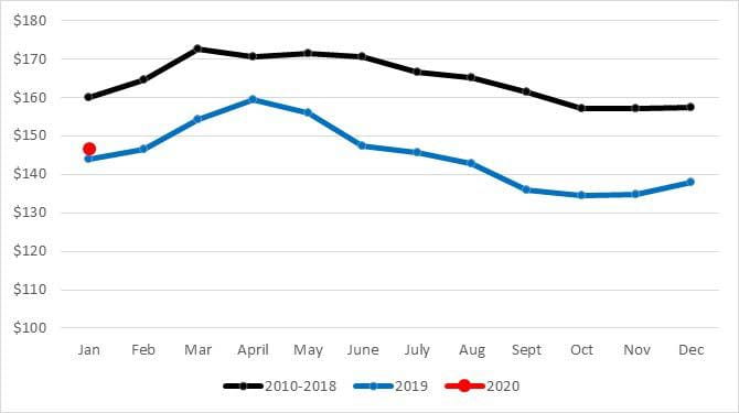 After a very frustrating fall, the calf market is showing some signs of life. To start the new year, 550 lb steers calves traded $12 per cwt higher in January than they did in November (see figure 1). This is by no means a great market, but enough to create some optimism for spring. Excessive rains continue to create challenges across the board and the market seems to consistently discount green calves that are likely perceived as high risk placements in this type of weather. Heavy feeder cattle prices have pulled back some from fall, but that is a typical seasonal pattern and I expect their prices to improve through the year.