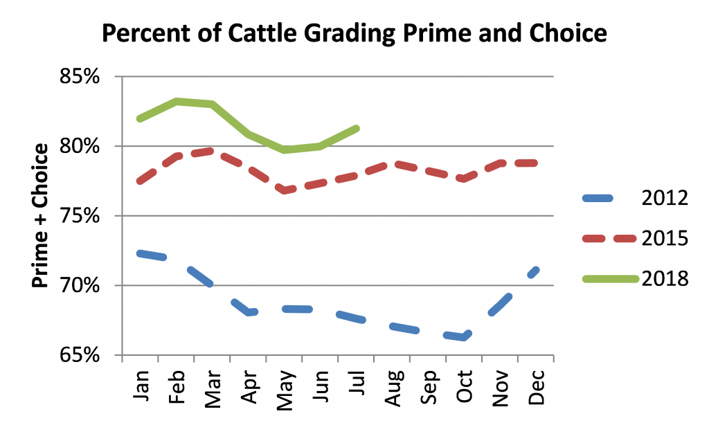 In the past seven years, there has been significant changes in how cattle grade. Figure 1 contains the monthly percentage of cattle grading Choice or Prime in the years 2012, 2015, and 2018. It is fairly easy to see the percentage increase from 2012 to 2015 and again from 2015 to 2018. Moving from 2012 to 2015, the beef cattle market saw 9 percent more cattle grade either Choice or Prime than in 2012. Similarly, so far in 2018, a little over 3 percent more cattle are grading Choice or Prime compared to 2015. There are likely several factors impacting the increased percentage of cattle grading Choice or Prime and they may include the removal of the beta agonist Zilmax (zilpaterol) from feedlots, carrying cattle to heavier weights, and genetic improvements.