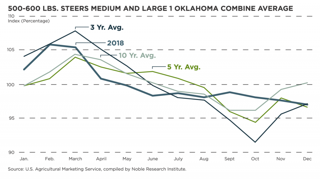 By looking at an indexed price for yearling steers weighing 500 to 600 pounds (shown in the chart), we can see that having a calf of this size has a higher price in the spring compared to the fall. This is influenced by multiple factors, including more calves going to the market in the fall due to more spring-calving herds in this part of the country. This increase in supply pushes prices lower.