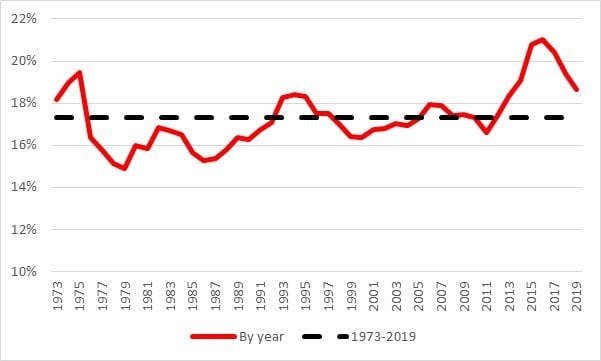 My preferred way to consider heifer retention is to look at it as a percentage of beef cow inventory. Based on these most recent estimates, heifer retention is running at 18.7% of beef cow inventory, which is slightly above the average going back to 1973 (see figure 1). Figure 1 really illustrates how high heifer retention was during the 2015-2017 time period, running above 20% in each of those three years. When one considers recent cow slaughter volume, and the likely age of this cow herd, it is my opinion that this level of heifer retention is probably about at replacement level for the current level of beef cow inventory.