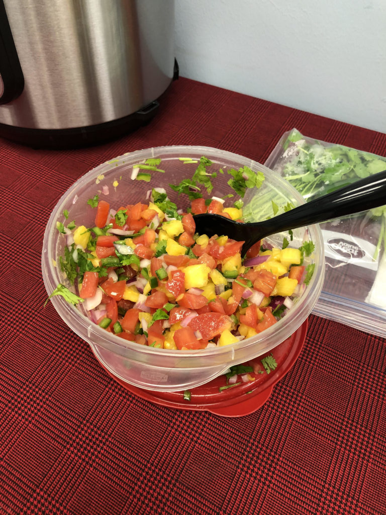• Add mixture to the hollowed pineapples and serve on flour tortillas with pineapple sales.