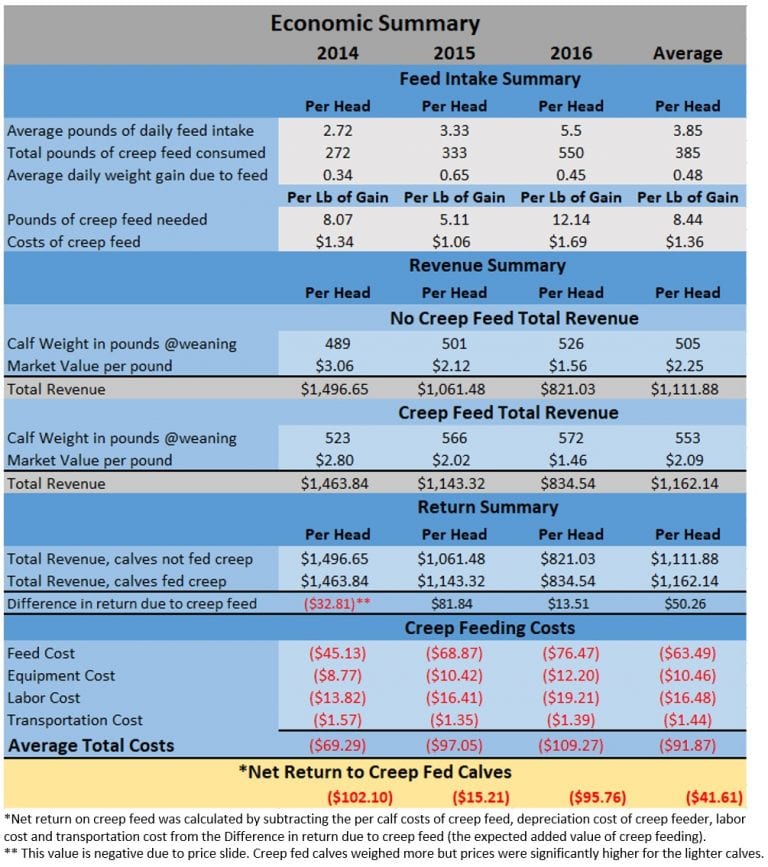 Conceptually, creep feeding provides increased nutrition to growing calves, which increases their weight at weaning. More pounds of calf to sell at weaning increases revenue, but does it increase profit? Past research has shown that supplementation (creep feeding) directly to growing calves significantly effects their weaning weight. Creep feeding may potentially address other concerns such as decreased calf productivity due to undernutrition to dam during gestation. In this work, it was also found that creep fed calves retained added weight from weaning through slaughter. The supplemental feed used in these experiments was a commercially available mix and used an additive designed to control intake. This is a commonly applied method of creep feeding, since it is thought to reduce labor costs associated with daily feeding and feed handling.
