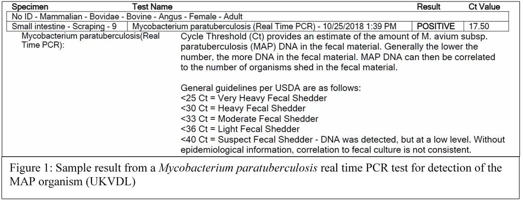 • Best test in a live animal: PCR on a manure (fecal) sample can be used as a primary diagnostic test to confirm the clinical signs of diarrhea and wasting suggestive of Johne’s disease.  PCR is an “organism detection test” meaning it detects the DNA of the MAP bacteria in the feces.  The PCR result is also a good indicator of the amount of MAP being shed in the feces (see Figure 2). A fecal culture in which MAP bacteria is grown in the lab is another “organism detection test” available but it is quite slow.  Johne’s liquid culture is incubated 42 days while solid media culture is incubated 13 weeks before results are known. Culture allows growth of the organism and acid-fast staining for identification.