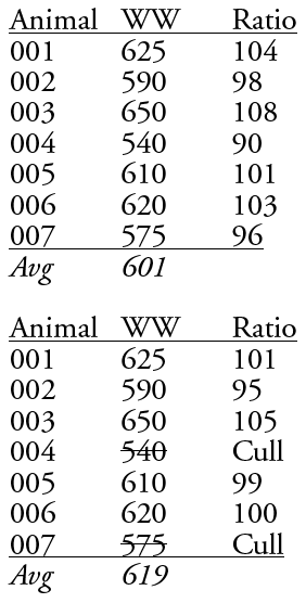 It’s inevitable that animals will be removed from a contemporary group over time. Whether it’s a calf that gets sick and requires extra attention, or a couple calves are brought to the barn as show prospects, group those cattle that get treated differently than the rest as their own contemporaries. If you bring in a bull calf and start feeding him a show ration to prep for state fair, you would expect him to outweigh your calves that are on pasture and light creep. It would not be a fair representation of the data to keep him in the same CG as all his buddies that didn’t come to the show barn. The show calves would need to be removed from the main CG and separated into their own smaller group. Contemporary groups are not a “mix and match” task, where you can pull animals out and put them back in once they’re back in the same pasture again. Once an animal leaves a CG, it can’t go back to the old one. The bull calf you took to state fair can be turned out in the development lot with the other yearlings after his show career, but he remains in his own CG for data recording purposes.