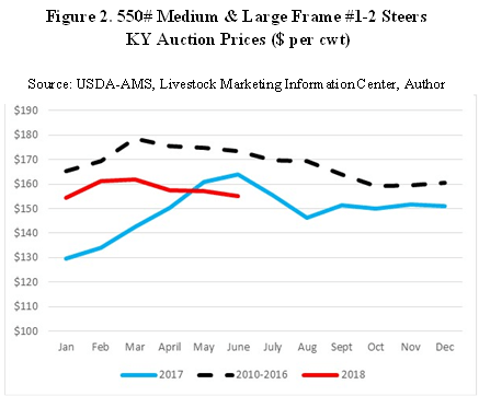 I always like to see the fed cattle market put in its summer lows and there are some indications that this has already happened for 2018. August CME© Fed Cattle Futures have rallied from late May and deferred futures are trading at a premium to August. Kentucky feeder cattle markets were relatively flat from May to June. Heavy feeder prices in Kentucky were basically unchanged over the last two months, but it was very encouraging that they held the ground they gained after April (see figure 1).
