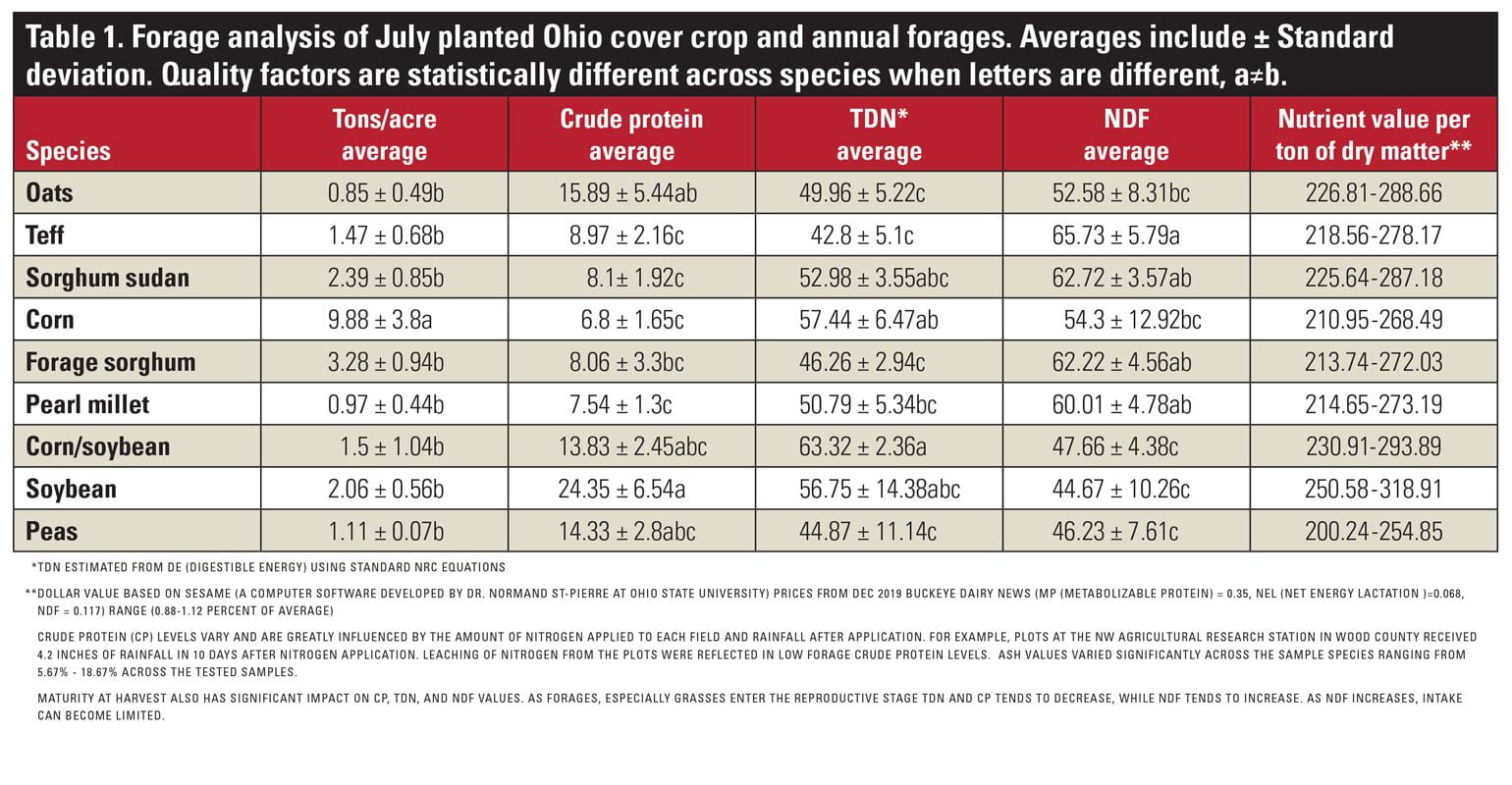 Table 1. Forage analysis of July planted Ohio cover crop and annual forages. Averages include ± Standard Deviation. Quality factors are statistically different across species when letters are different, a≠b.