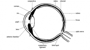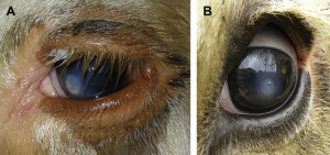 Figure 1: Corneal ulceration in the early stages of pinkeye. Photo from Veterinary Clinics of North America, Food Animal Practice 26 (2010), page 489.