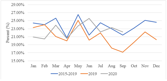 So what has been happening to the share of cattle transactions (i.e. negotiated cash, forward contract, formula, and negotiated grid) sold on a live basis during COVID-19? In short, there has been little change in negotiated cash as a share of all cattle transactions, on average nationally since January 1, 2020. Although there appears to be some regional differences with Northern Plains states experiencing slightly more volatility in the share of negotiated trade compared to Southern Plains states. Like most price series, cattle transactions are seasonal. Figure 4 displays the seasonality of negotiated cash (live + dressed) as a share of all cattle transactions nationally for 2015-2019, 2019, and 2020. There has been no change to the seasonality patterns of negotiated cash trade in 2020 compared to the five-year average. The decline in Q3:2019 and Q4:2019 came in large part from the Texas-Oklahoma-New Mexico region not reporting sales because confidentiality requirements were not met. The drop in negotiated cash trade began to fall prior to the Holcomb Fire incident in August 2019. Thus, it is unlikely that the Holcomb Fire caused the lack of reporting but could have prolonged it. Figure 5 shows the seasonality of negotiated cash as a percentage of all live cattle transactions. Year-to-date in 2020, more cattle have been sold live via negotiated cash compared to the five-year average. Even during the government quarantine and packing plant closures (March-August), on average, the percentage of cattle sold live via negotiated cash was above the five-year average. Figures 4 and 5 (below) show some graphical evidence that the Holcomb Fire and COVID-19 market disruptions are unlikely to have affected the national percentage of cattle sold (live, dressed, or live+dressed) via negotiated cash.
