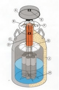 The other reason you need to be careful when hauling the nitrogen tank is that while manufacturers work to make tanks sturdy, they are still oversized thermoses. If you look at the picture you can see that the inner container is only attached to the outer container at the neck. Rough treatment can cause a crack in this connection. Once the vacuum is lost through a crack the tank will fail rapidly leaving you with a total loss of the contents.