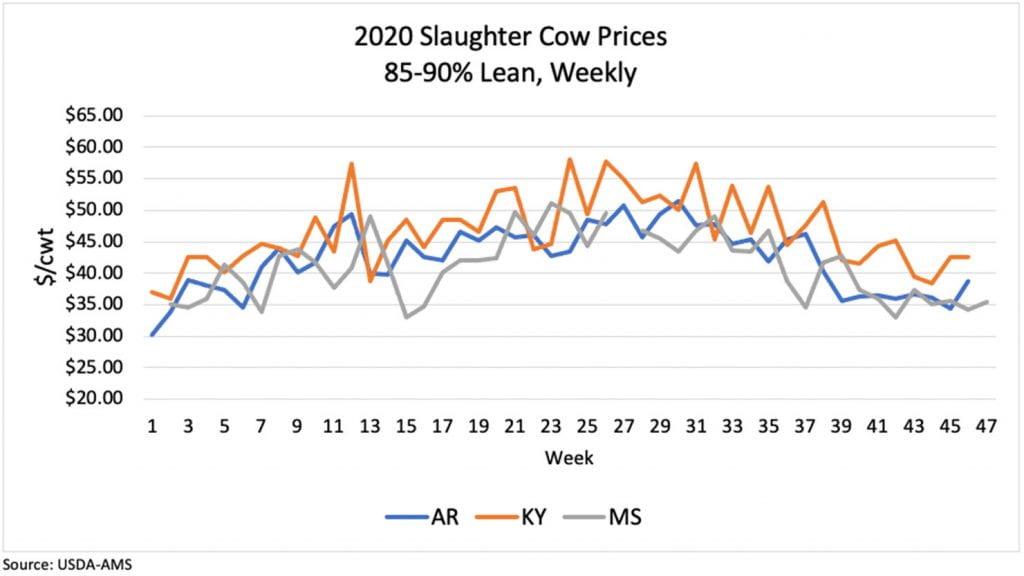 In addition to feeder cattle markets, the fall is also an important time of year for slaughter cattle markets as many cattle producers across the country make culling decisions. Because of this, an update on slaughter cow markets is warranted. The first figure provides prices for 85-90% lean slaughter cows sold in AR, KY, and MS. The most recent available data is for the week ending November 22, 2020. For that week, average slaughter cow prices were $38.79/cwt, $42.49/cwt, and $35.38/cwt for AR, KY, and MS, respectively. These prices correspond to a 13%, 0%, and 3% week-over-week change.