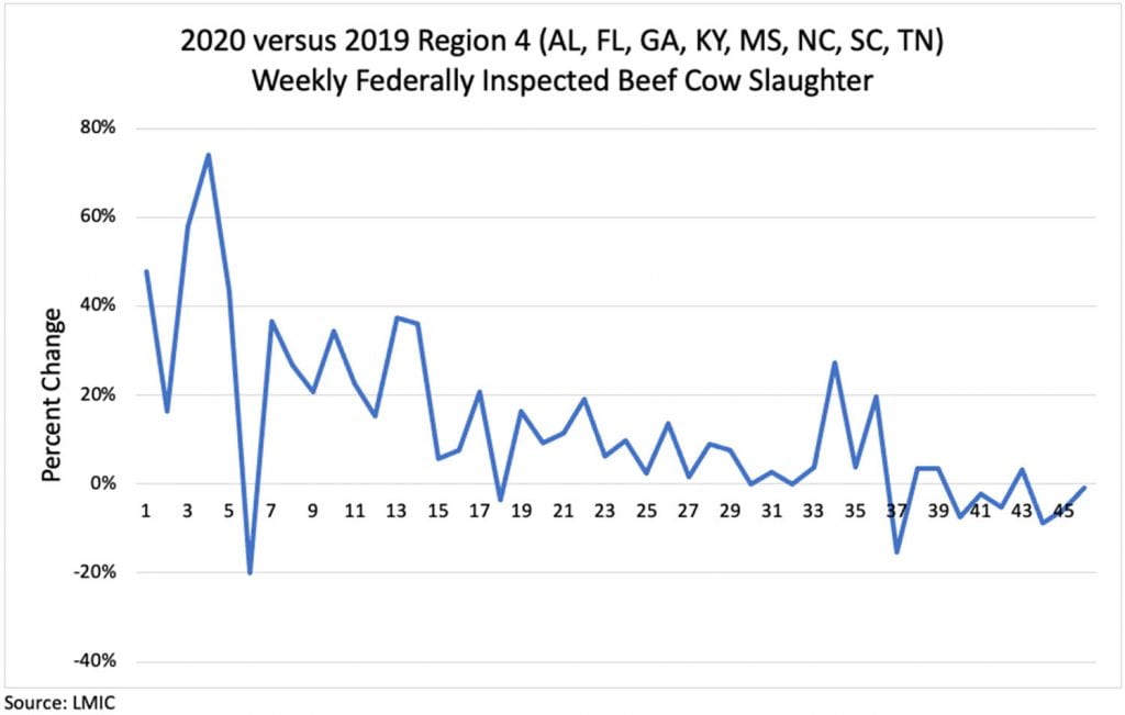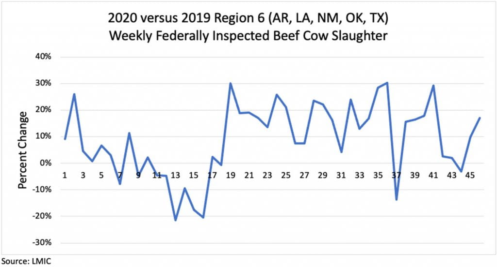 Regional beef cow slaughter has also averaged well-above 2019 in parts of the country. In region 6, which corresponds to AR, LA, NM, OK, and TX, Sep-Nov beef cow slaughter has averaged 11% above 2019 slaughter for the same period. Region 4, which refers to AL, FL, GA, KY, MS, NC, SC, and TN, beef cow slaughter has more closely tracked 2019 this fall. Region 4 Sep-Nov beef cow slaughter has averaged 1% below 2019 slaughter.
