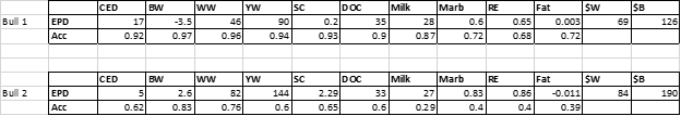 Figure 1. Example EPD’s of calving ease sire (Bull 1) and high growth and performance sire (Bull 2).