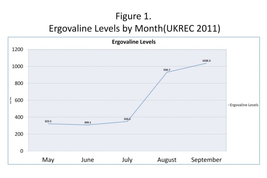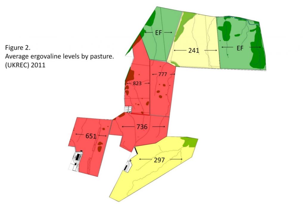 There are some keys to getting a high percentage of cows pregnant for a spring calving season. The most general problem, in my opinion, is that the winter feeding program isn’t adequate to support required body condition for early rebreeding. Cows should enter the breeding season in good body condition (Body Condition Score 5) which doesn’t always follow our winter feeding programs. It seems that we sometimes try to “rough ‘em” through the winter and hope that spring grass will “straighten them out”. That is a sure formula for delayed breeding or open cows. Spring-calving cows need to conceive early in the breeding season (before late June) for best results. We conducted a trial at the UKREC (Western Kentucky) several years ago in which similar cows were separated into three breeding periods of 45-days each on high-endophyte fescue – see Table 1. Cows which were exposed to bulls from June 19 to August 4 had a pregnancy rate of only 59%. At this location, the average maximum daily temperature reaches 90°F by about June 20. This elevated temperature, coupled with the endophyte that is present in most fescue pastures, likely contributed to that decreased performance.We have also measured the alkaloid levels in high-endophyte fescue at this location. Since the primary culprit in toxicity of high endophyte pastures seems to be ergovaline, let’s look at ergovaline levels (Figure 1) across the growing season. After our July (about July 10) measurement, the ergovaline levels increased dramatically. So this toxicity, coupled with high temperatures, appears to mean that breeding will not occur at acceptable rates in July, August and September. Therefore, cows need to be pregnant by the end of June for best results.Ergovaline levels differed greatly by pasture, too (see figure 2). That information could make it possible to avoid the “hot” pastures during the summer months. The trial in Table 1 was conducted in the “hot” pasture (unbeknown to us). The two yellow pastures are high endophyte but always gave better than expected results in past years. The ergovaline levels can explain a lot. Armed with this information, we would prefer to be in the yellow areas during heat stress and breeding.