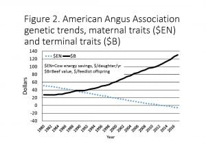 Angus also has an index that measures cow energy savings, $EN.  If you market calves at weaning the genetic change represented by that index (Figure 2) may not be an improvement.  A 2017-born daughter eats $57 more feed per year than an average 1980 daughter.  This comes from heavier live weight, higher milk production and higher maintenance requirements.