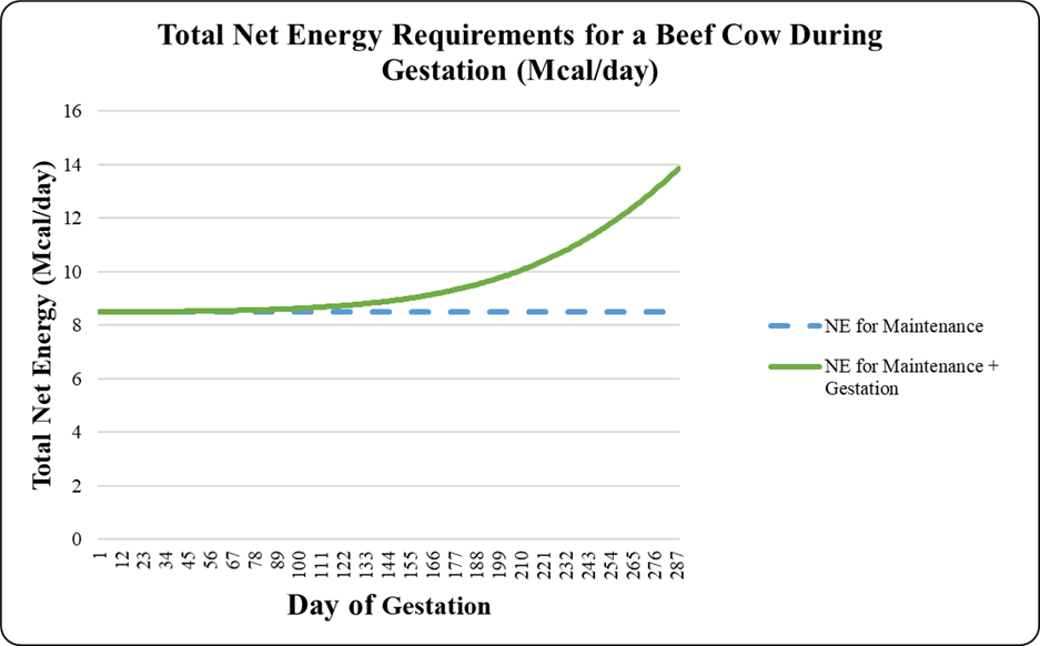 In spring calving beef cow herds, females are typically in the last third of gestation from January to March. The last trimester of gestation is when most fetal growth occurs, with an Angus type fetus growing approximately 0.9 lbs/day towards the end of the third trimester. The rapid growth of the fetus at this time requires the cow to meet the fetal nutrient requirements by increasing her nutrient intake and/or mobilizing her body tissues. Figure 1. demonstrates the increase in nutrient requirements for maintenance and throughout gestation. At thermoneutral conditions, a 1200 lb non-pregnant and non-lactating cow, requires 8.5 Mcal Net Energy/day to maintain her body weight. At the end of gestation, the same cow requires 14 Mcal Net Energy/day to maintain her body weight and meet the requirements for the growth of a 77 pound calf.