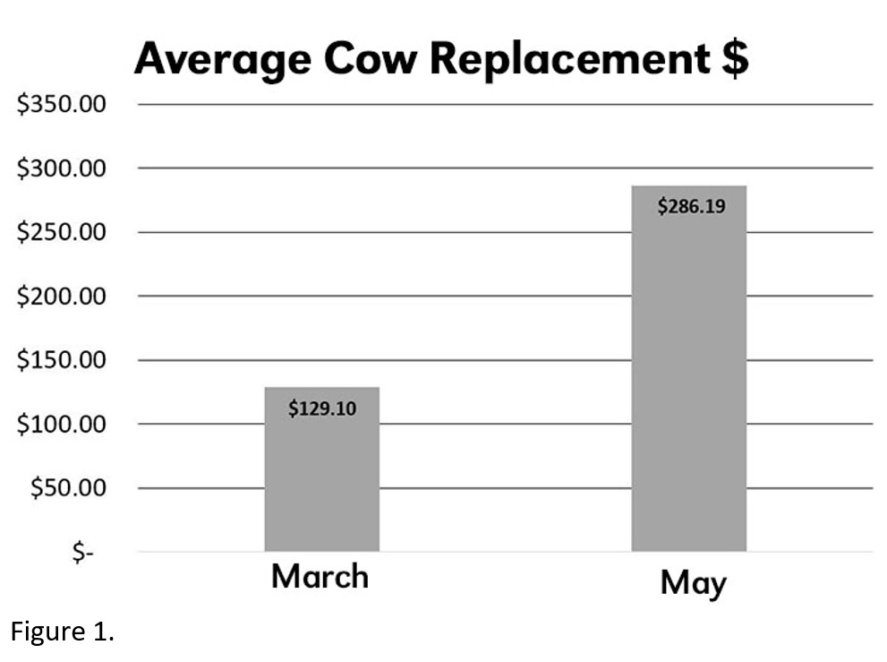The nine-year average market price received for March-born steers was $162.84/cwt and $148.21/cwt for 4 cwt and 5 cwt steers, respectively. The 4 cwt May-born steers averaged higher at $170.84/cwt, no May 5 cwt steers were produced. This price difference shows that the May-born calves sold for a higher average price per pound than the March calves. This difference is due to seasonal price variation. However, the seasonal price advantage and the price slide difference for May-born calves was overcome by the sheer pounds of production achieved by the heavier March-produced calves. The March-born weaned calves sold on average for $669.19/hd, while May-born weaned calves averaged $617.68/hd. Cow replacement costs for the March systems averaged $185.22/hd whereas the May-born averaged $297.87/hd, an overall average difference of $112.65/hd giving the March system the advantage in cow replacement costs (Figure 1). This was due to both higher replacement rates and the increased cost per head due to seasonal prices for May cows. Average feed costs for the March system were $395.27/pair whereas the May average was $321.40/pair. The final result for the nine years was that March cows annually averaged $25.23/hd profit while the May cows averaged a negative $65.77/hd. However, due to the cyclical nature of the cattle markets over the nine-year period, there were individual years when the May system had higher net returns than those of the March system.