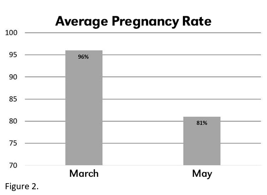 This article demonstrates the importance of considering all the factors that alter a calving system’s profitability. Three key factors that altered the economic ranking of the two systems are changes in 1) productivity, 2) production costs and 3) market prices. Productivity changes included lower pregnancy rates (Figure 2) for the May-calving system due to a declining plane of nutrition related to pasture maturity during the breeding season. May cows also weaned calves with lighter body weights. May-calving cow’s production costs had mixed effects. May-calving cows had significantly lower feed costs than March-calving cows, but higher replacement costs.