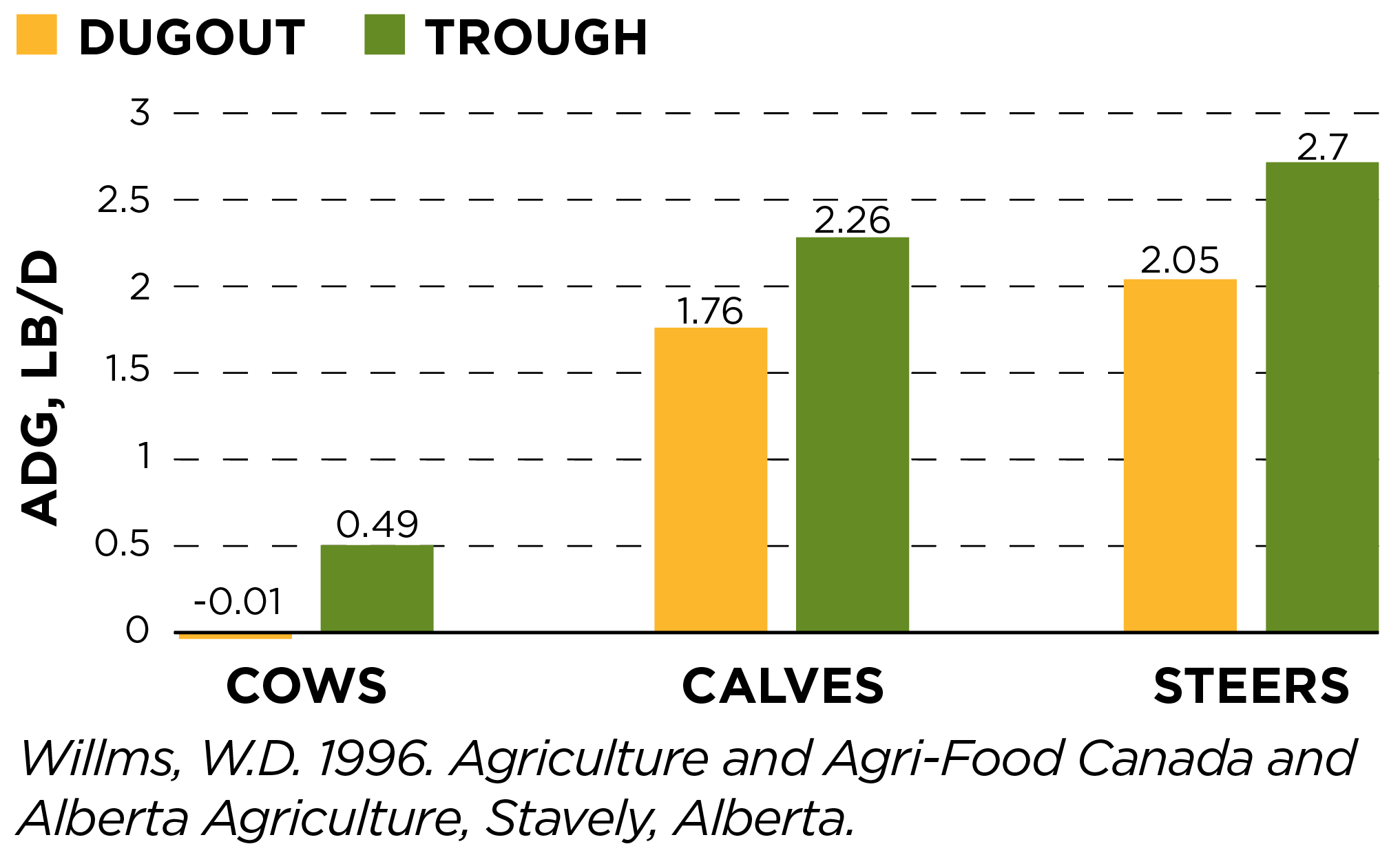 In this study comparing the effect of water sources on average daily gain (ADG), cows, calves and steers on pasture gained significantly more pounds per day when supplied with water pumped to a trough vs. drinking directly from a pond (dugout).