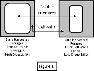 I expect neutral detergent fiber (NDF) content is going to be higher than normal in many producer’s hay bales because of the over mature condition of the hay. As forage plants mature, cell wall production in the plants increase and NDF content will increase, see Figure 1. As NDF content in a forage increases, dry matter intake decreases because it cannot pass through the cow’s system as fast. Therefore, with NDF percentages, we can accurately predict forage intake as it relates to bulk; or we could say, how much an animal will eat before its stomach gets full and stops eating. The higher the NDF value, the less the livestock can physically eat of that forage/day.
