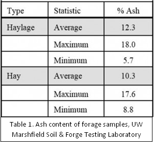 ternal, e.g. minerals like calcium, magnesium, potassium and phosphorus, and external, e.g. dirt, bedding, sand, etc. The average internal ash content of alfalfa is about 8% and of grasses is about 6%. Additional ash in a hay or silage sample is contamination with dirt, sand, etc. As shown in Table 1, a summary of ash content of forage samples submitted to the University of Wisconsin Soil and Forage Analysis Laboratory, the average ash content of haylage is 12.3% and of hay is 10.3%. Assuming the silage is mainly alfalfa and the hay has a higher percentage of grass, forage samples are averaging about 4% ash contamination from external sources. Note that some samples have been as high as 18%. This means this farmer had fed almost 1 pound of dirt with each 5 pounds of hay or haylage!”